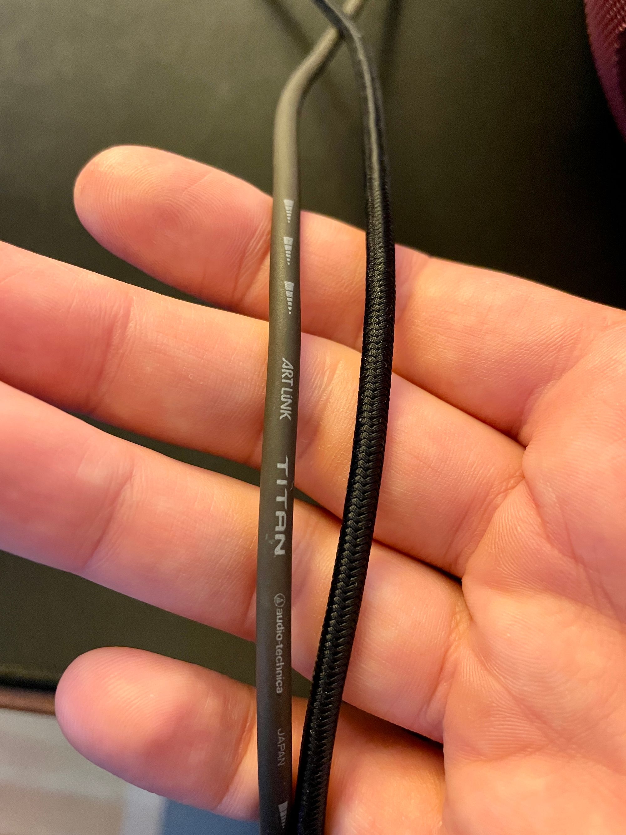 The new Audio Technica cable (pictured in the gallery above) is wrapped in a cloth-like material, and you can hear every single thing that comes into contact with that cable. It has the perfect texture and stiffness to be influenced by everything. It'll make noise against my shirt as I tilt my shirt. It'll make noise if it taps against my chair.