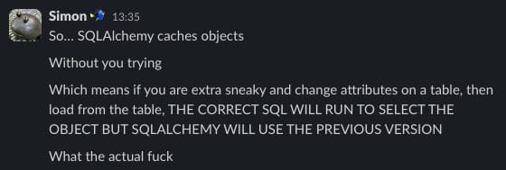 I've largely transitioned to a management role recently, which means I'm not very involved in the codebases at my company anymore. But in the last few weeks I've had the chance to poke around and make some changes, and what I've seen has been shocking: very experienced developers have started using ORM features from SQLAlchemy, a very popular Python ORM and a SQL toolkit library.
